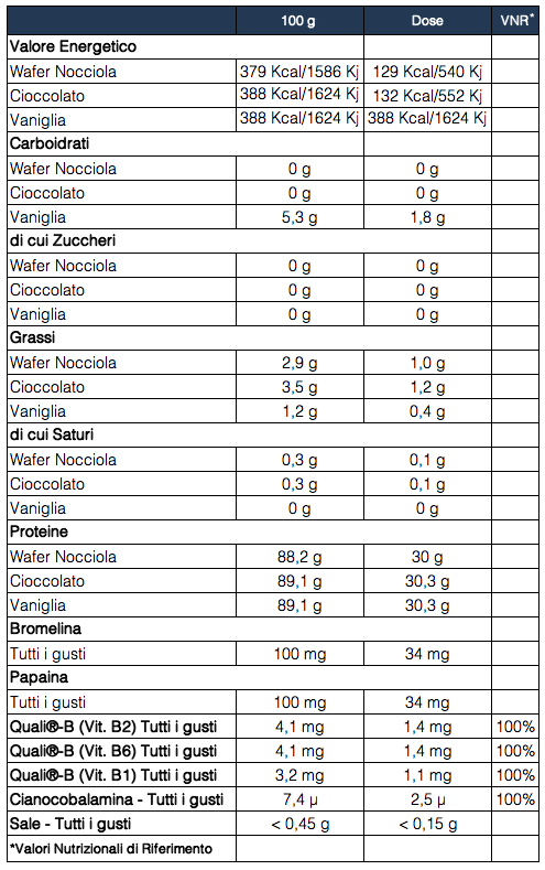 Optipep® 90 PRO (Siero Proteine Isolate Idrolizzate (90 D.H. 4) LATTE, SOIA), Optipep® 9088 (Siero Proteine Isolate Idrolizzate (90 D.H. 4) LATTE, SOIA), Cacao Olandese in polvere, pH Balance™ (Sodio Bicarbonato, Potassio Cloruro, Silicio Biossido), Aroma Wafer Nocciola, AminoFE™ (L. rhamnosus LR04, L. acidophilus LA02, B. breve BR03 e B. animalis subsp. lactis BS01), Bromelina, Papaina, Quali®-B [Riboflavina (Vit. B2)], Quali®-B [Piridossina HCl (Vit. B6)], Quali®-B [Tiamina HCl (Vit. B1)], Cianocobalamina (Vit. B12), Sucralosio E955. Con Edulcorante.